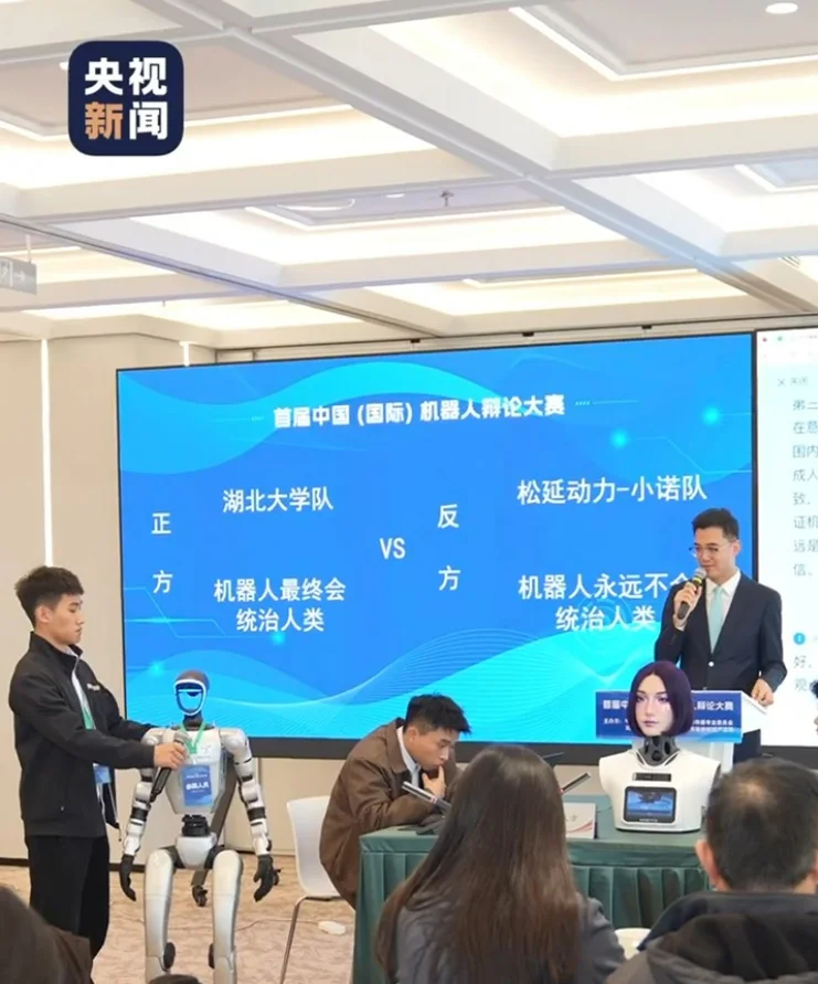 The finals adopted a "machine vs. machine" format, with robots from each team engaging in independent debates. The topic for this championship match was "Will robots dominate humans or not?" What exciting debates did the robot debaters present? Let's take a look with the reporter from the central station.